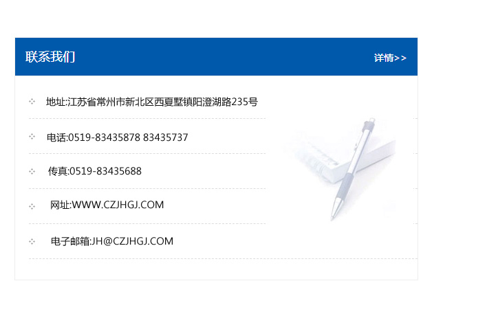 地址:常州市新北區友邦商務大廈1幢16、17層  電話:0519-85101652  傳真:0519-85112595  郵編:213022  網址:www.cz-jiayue_cn.90tongxiao.com  郵箱:xiajifengaa@163.com